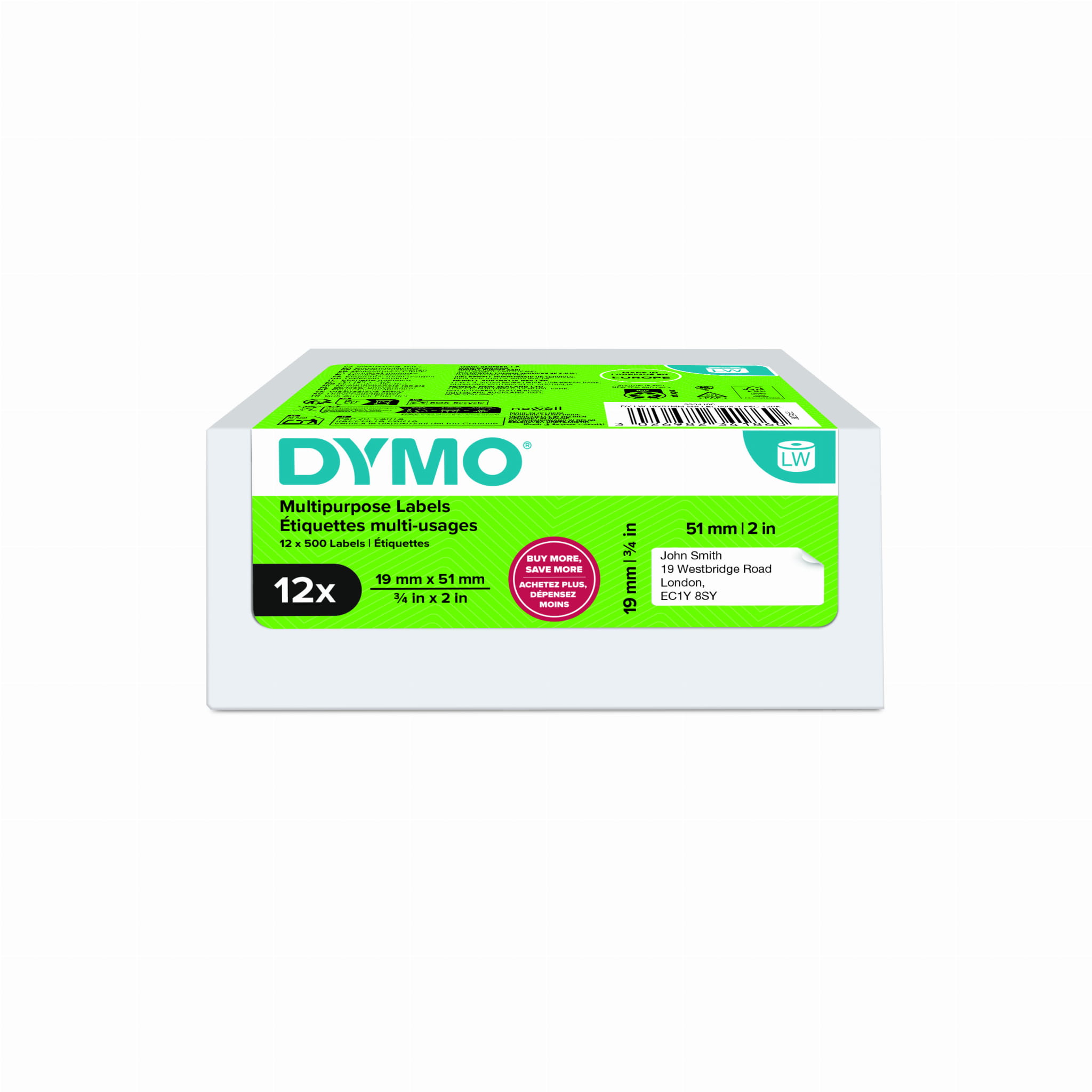 DYMO Etykiety różnego przeznaczenia MULTI VALUE PACK 24 szt. - 19 x 51 mm, białe, 12 rolki po 500 etykiet, 11355, S0722550, 2234184