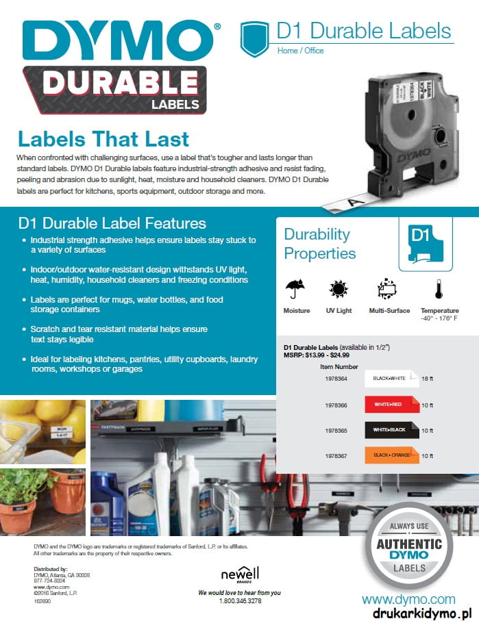 Trudne powierzchnie wymagają bardziej wytrzymałych i trwalszych etykiet niż etykiety standardowe. DYMO D1 Durable przylegają do powierzchni dzięki zastosowaniu kleju przemysłowego, dlatego m.in. nie odklejają się, nie ścierają i są trwałe nawet w przypadku działania światła słonecznego, ciepła, wilgoci i domowych środków czyszczących. DYMO D1 Durable są doskonałe do etykietowania w kuchniach, sprzętu sportowego, w miejscach do przechowywania na zewnątrz i nie tylko.