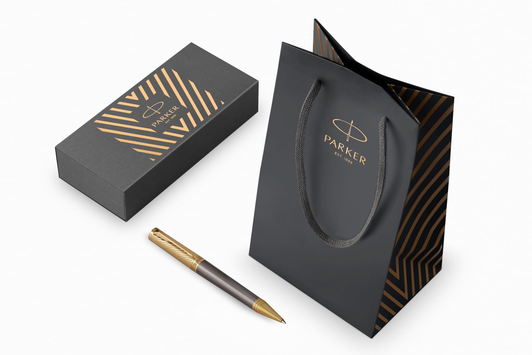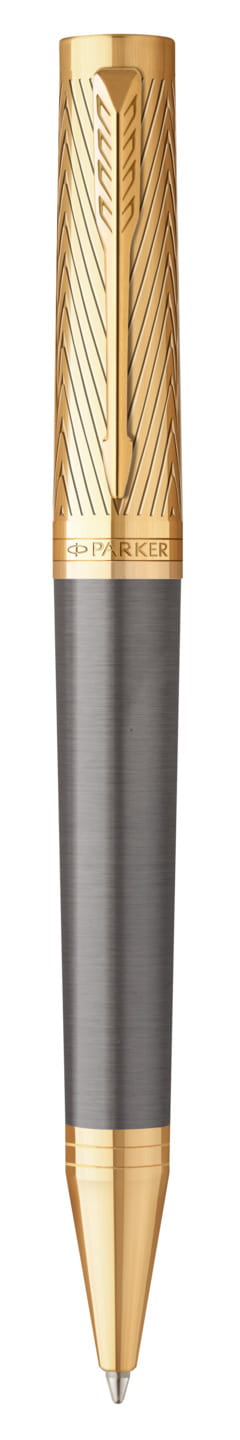 • opakowanie: pudełko upominkowe Parker w szaro-złotej stylistyce pióra, łączącej wzór jodełki na skuwce ze stylistyką wieczka