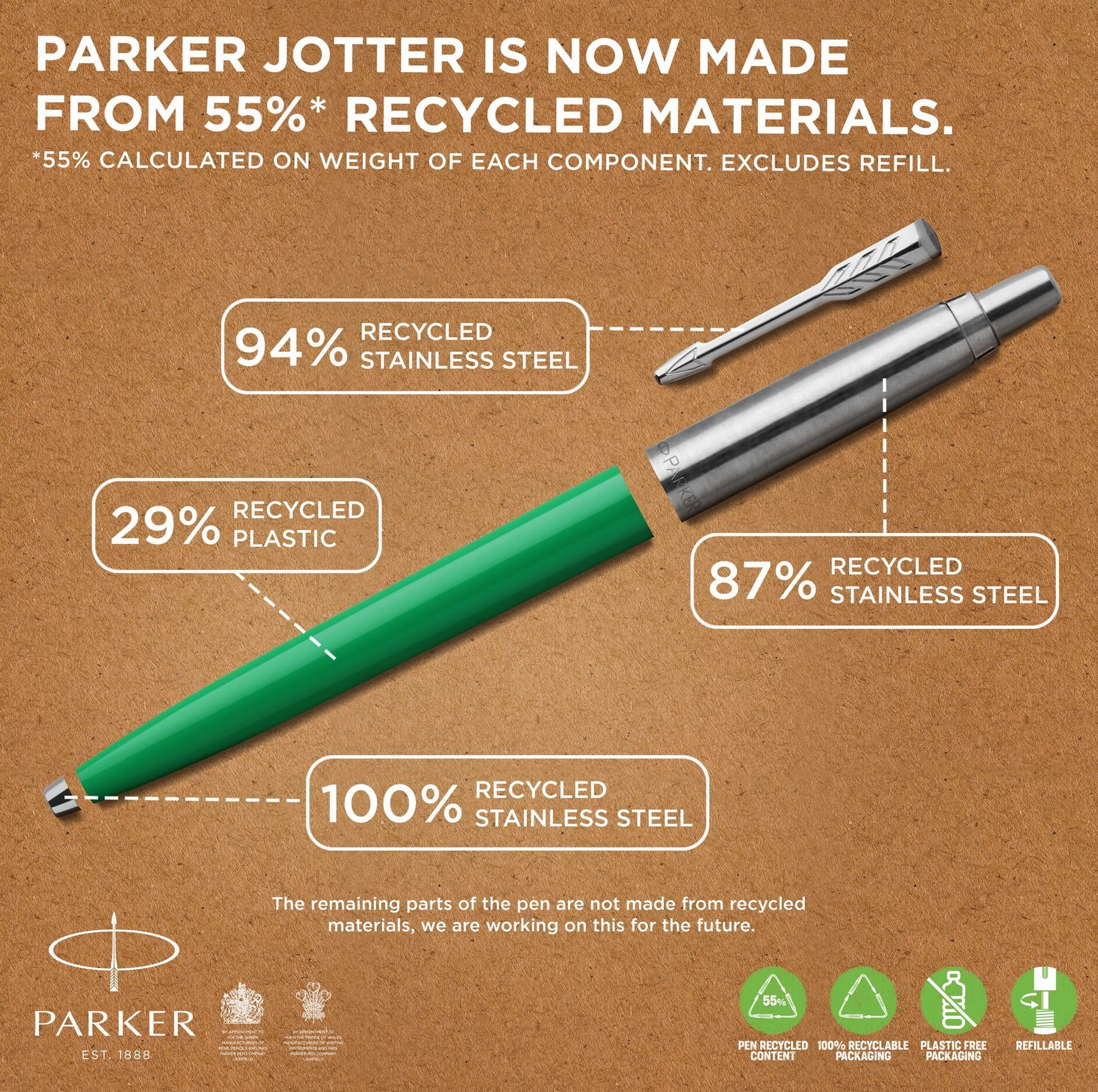 Długopis wykonany we Francji zgodnie z najwyższymi standardami jakości. A ponieważ marce Parker zależy, aby specjalne okazje przynosiły wiele radości, lecz nie przyczyniały się do niepotrzebnego wytwarzania odpadów, długopis można ponownie napełniać wkładami do długopisów Parker QUINK oraz wkładami żelowymi.