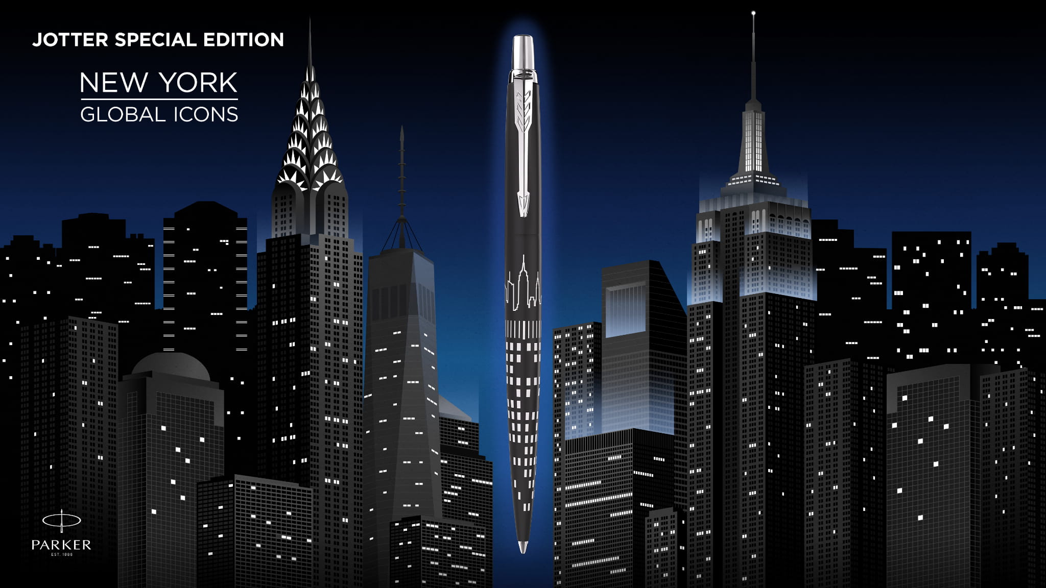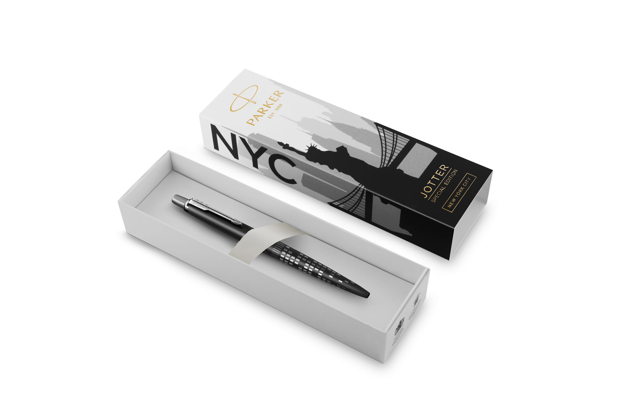 Długopis Jotter New York został zainspirowany Nowym Jorkiem, miastem, które nigdy nie śpi. Jego korpus pokrywa wzór nawiązujący do jasno oświetlonych nocą drapaczy chmur metropolii. Panorama miasta i wzór zostały precyzyjnie wydrukowane laserowo na obudowie, a wykończenie w kolorze matowej czerni dopełnia wyrafinowanego, wysokiej klasy wyglądu.