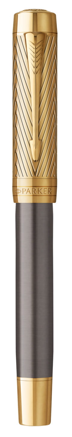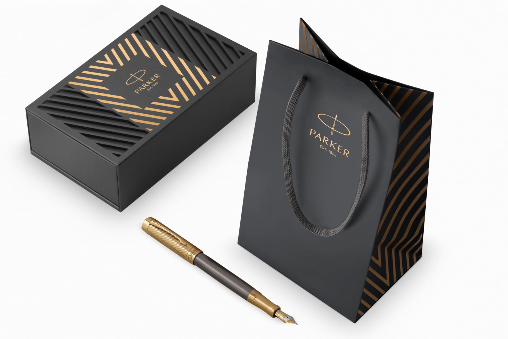 - opakowanie: pudełko upominkowe Parker w szaro-złotej stylistyce pióra, łączącej wzór jodełki na skuwce ze stylistyką wieczka