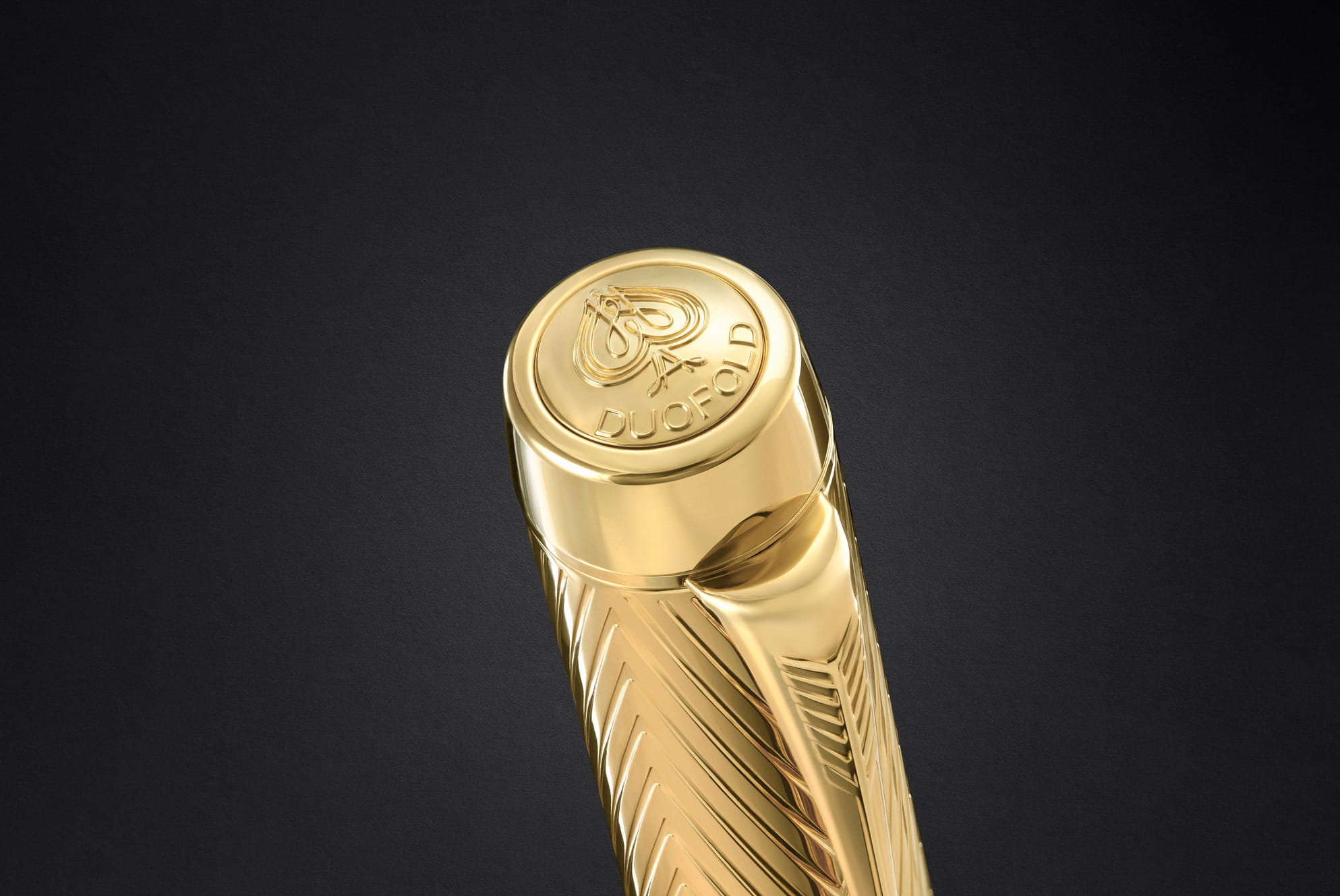 - nasadka: pokryta 23 karatowym złotem z wzorem trawionym chemicznie, ikoniczna korona nasadki Duofold z symbolem asa