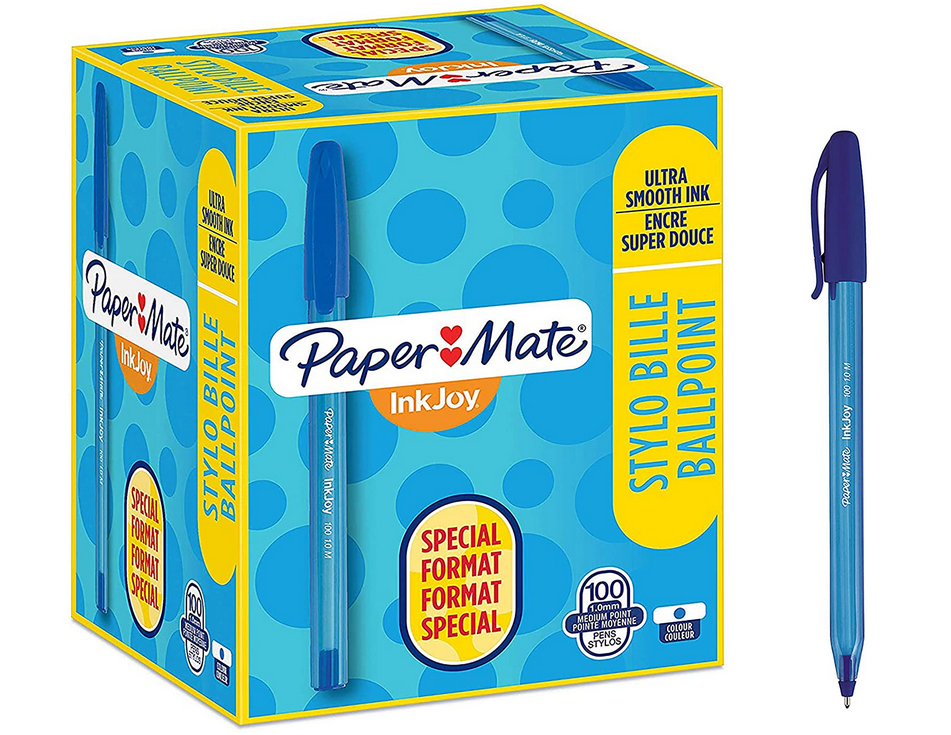 Długopis InkJoy 100 M niebieski z zatyczką firmy Paper Mate  z tuszem o rewolucyjnej formule ULV, dzięki której długopis płynnie przesuwa się po papierze i bardzo szybko wysycha.